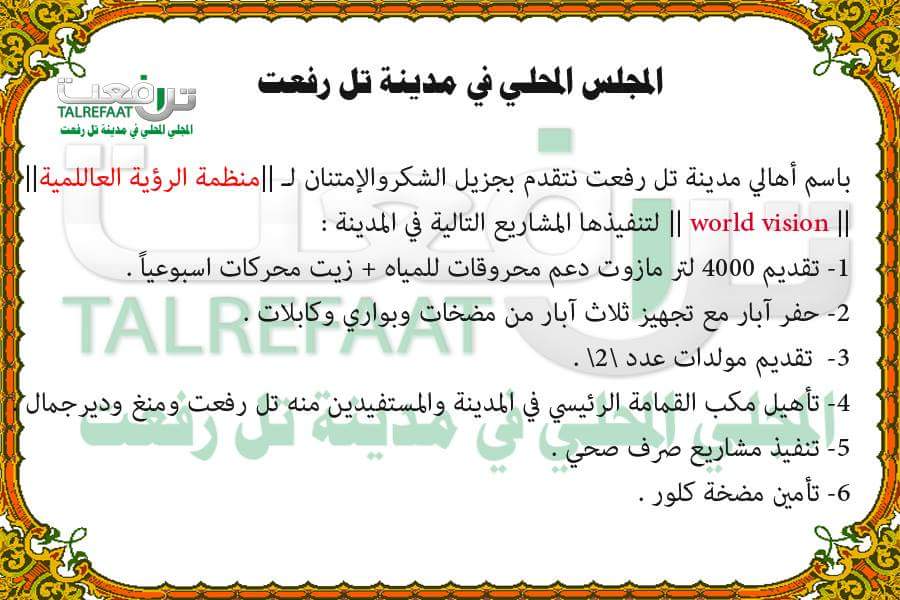 باسم أهالي مدينة تل رفعت نتقدم بجزيل