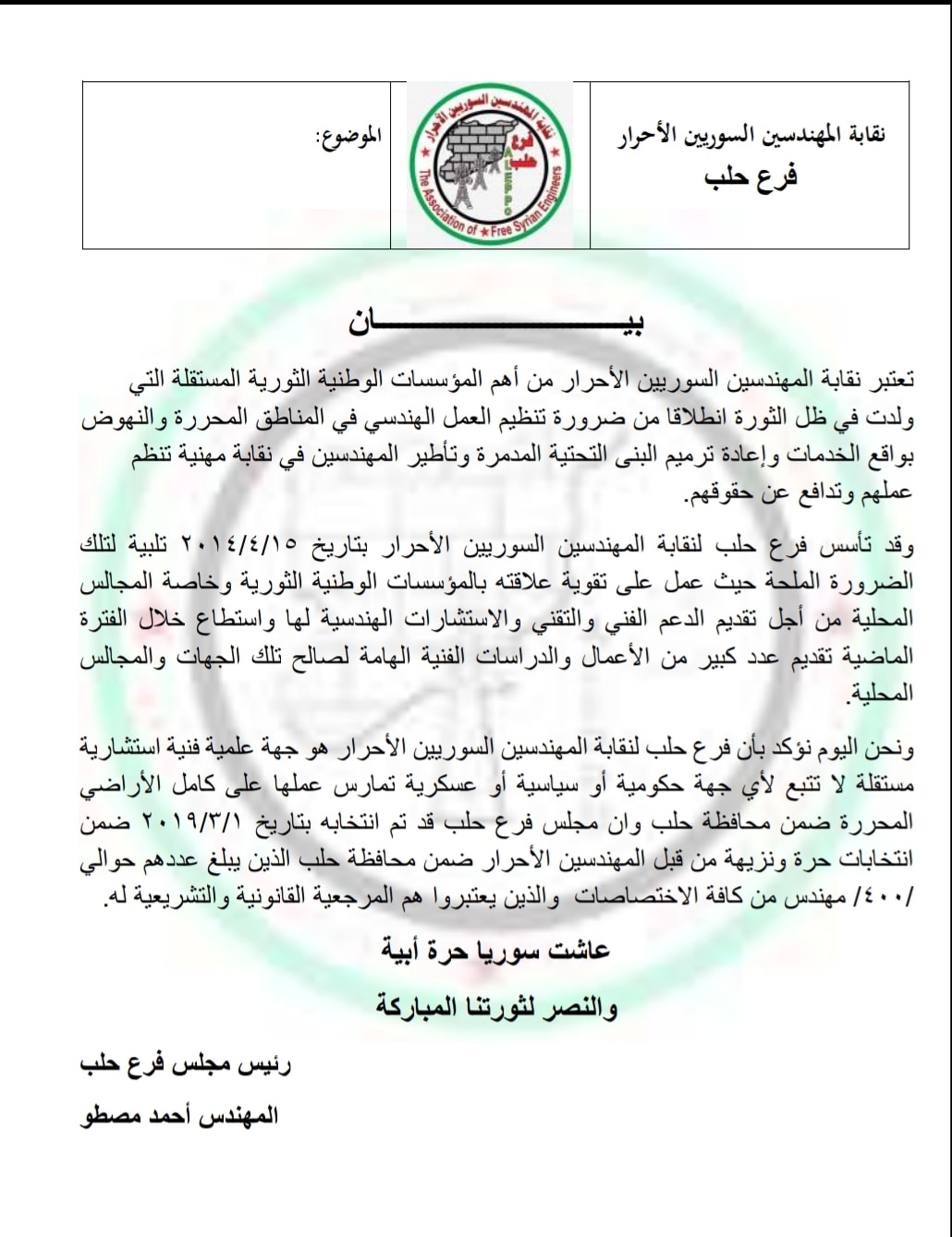 بيان تعريفي بنقابة المهندسين السوريين الأحرار فرع حلب والتأكيد على استقلاليتها