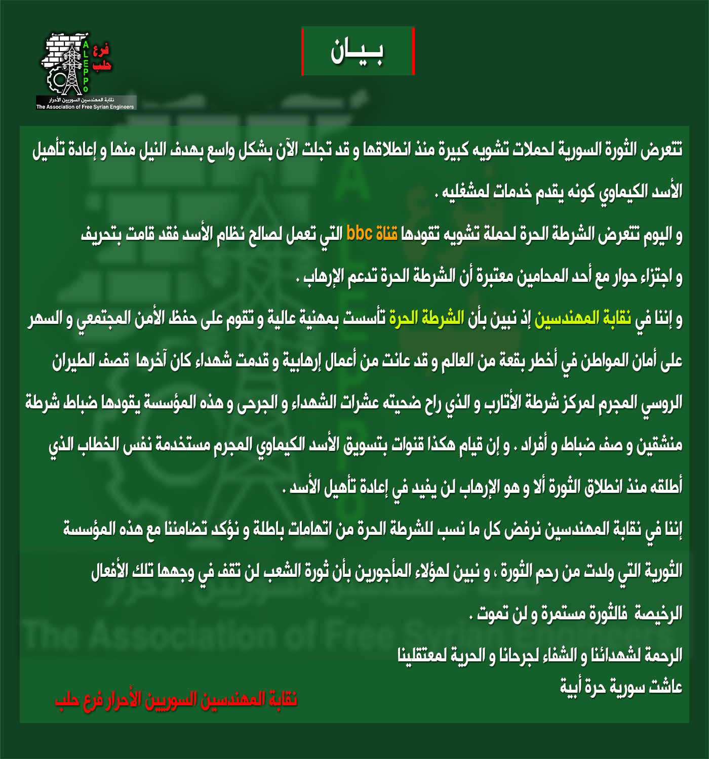 بيان من نقابة المهندسين السوريين الأحرار فرع حلب تدين فيه الحملة التي تتعرض الشرطة الحرة لحملة تشويه تقودها قناة bbc