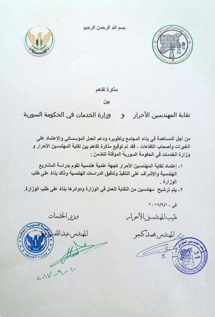 بيان حول مذكرة التفاهم الموقعة بين نقابة المهندسين السوريين الأحرار فرع حلب ووزارة الخدمات في الحكومة المؤقتة