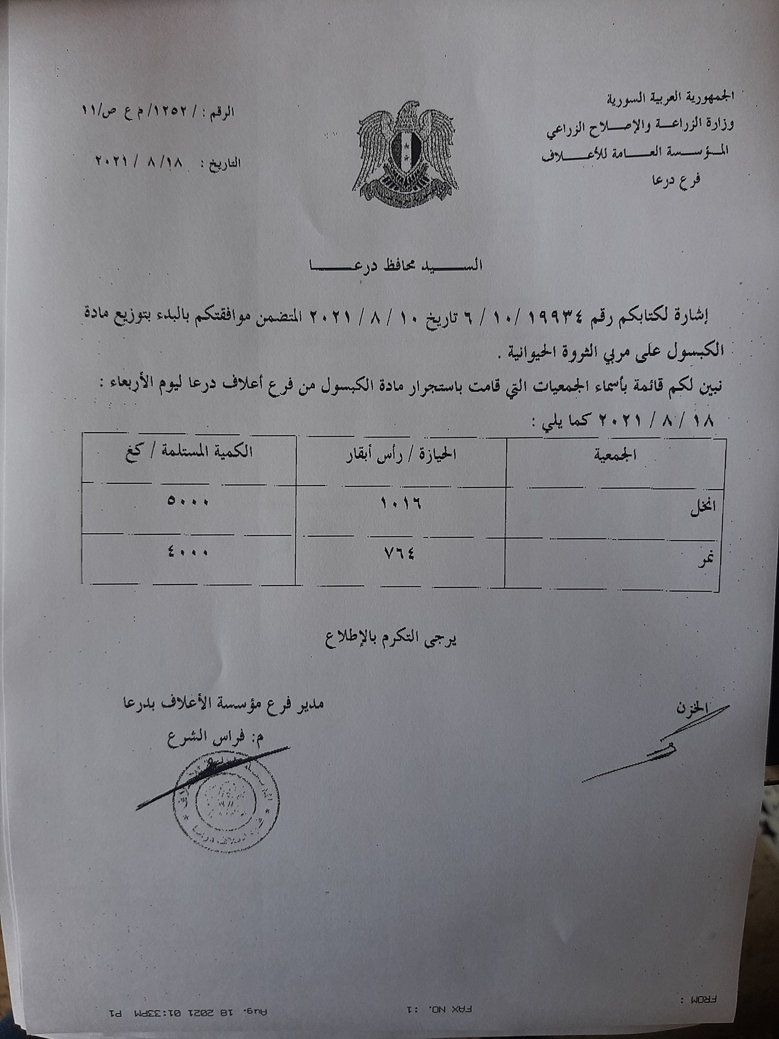 بيان من المؤسسة العامة للأعلاف في درعا موجه إلى محافظة درعا حول أسماء الجمعيات التي قامت باستجرار مادة الكبسول من المؤسسة
