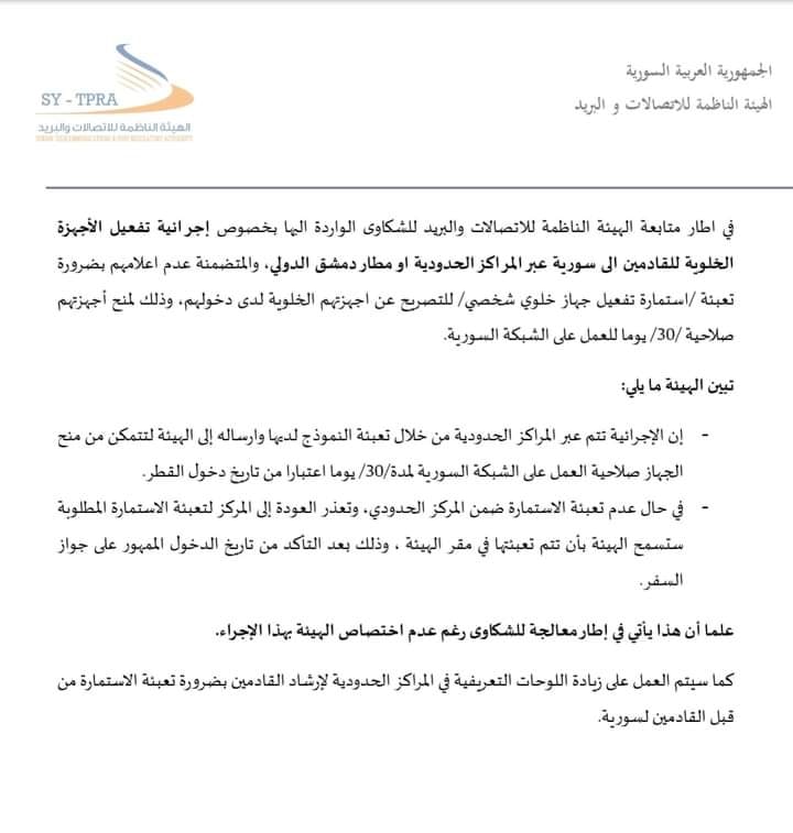 تعميم من الهيئة الناظمة للإتصالات والبريد بخصوص إجرائية تفعيل الأجهزة الخلوية للقادمين إلى سوريا عبر المراكز الحدود ومطار دمشق الدولي
