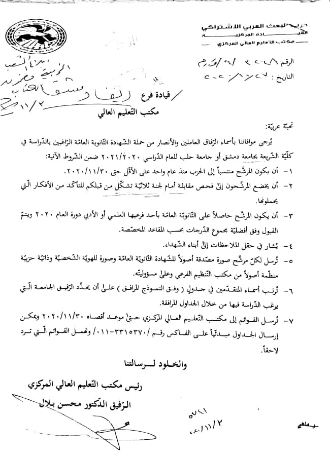 تعميم من مكتب التعليم العالي المركزي في حزب البعث طلاب البكالوريا الذين يريدون تسجيل اختصاص شريعة