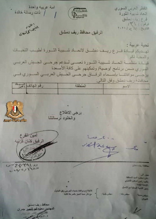 بيان من اتحاد شبية الثورة فرع ريف دمشق إلى محافظ ريف دمشق بشأن دعم جرحى الجيش العربي السوري ضمن برنامج وصية وتمكينهم على كافة الأصعدة