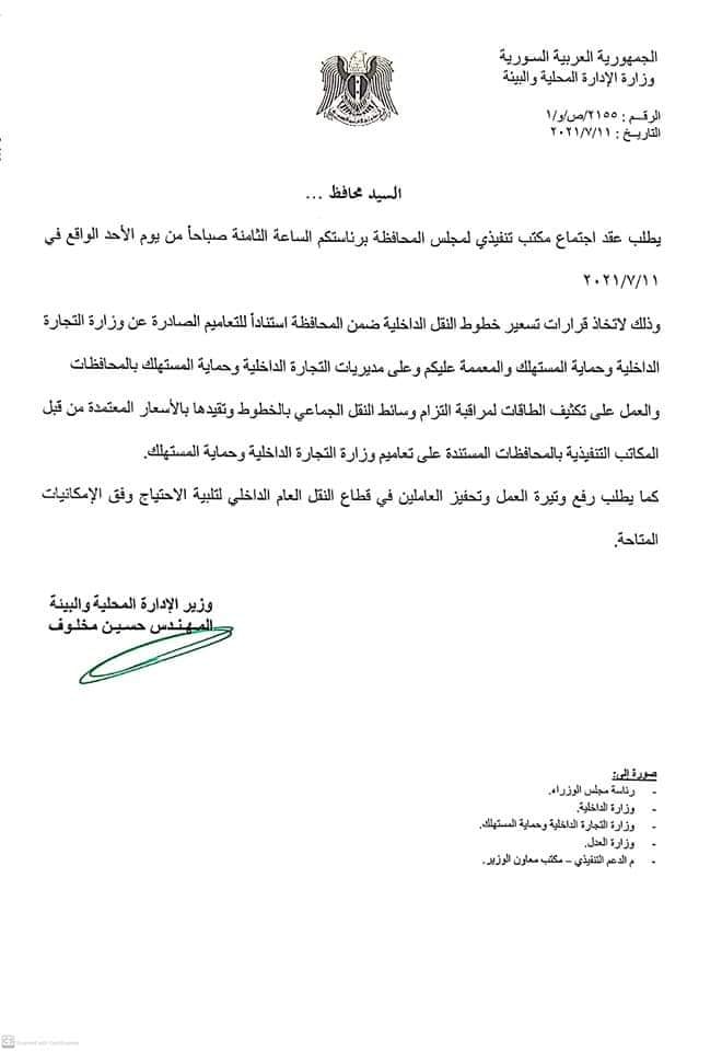 تعميم من وزارة الإدارة المحلية والبيئة إلى مجالس المحافظات بشأن لضبط قرارات تسعير خطوط النقل الداخلية