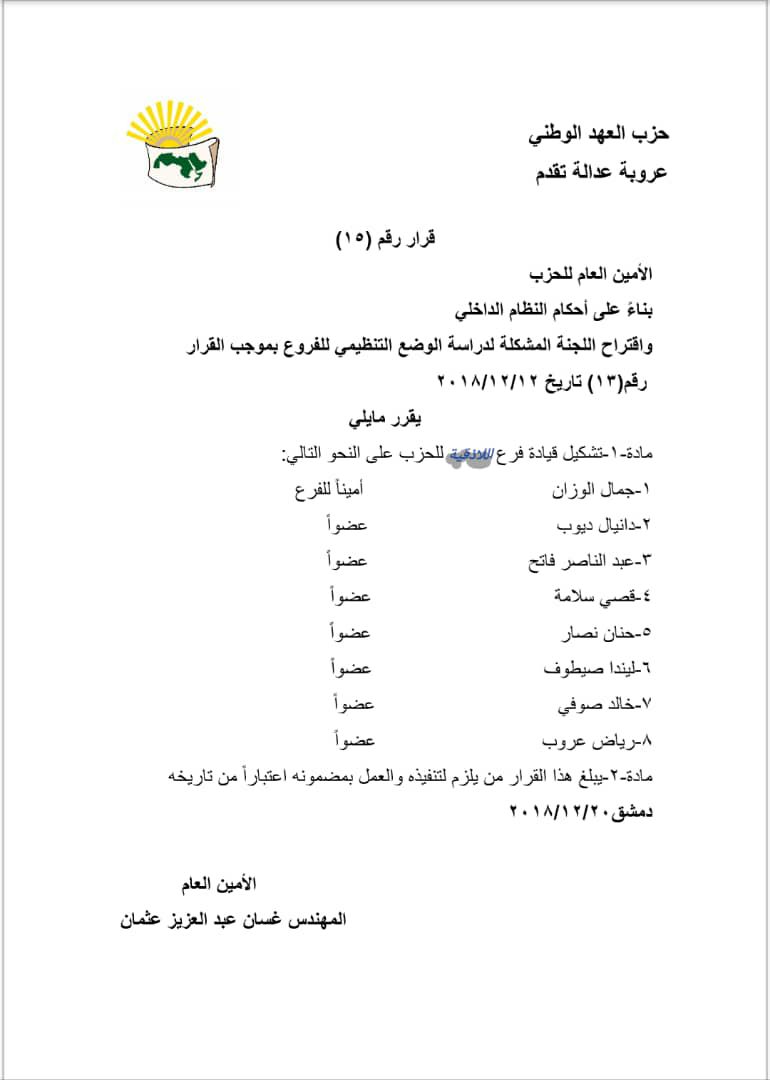 قرار من حزب العهد الوطني بشأن تشكيل قيادة فرع اللاذقية