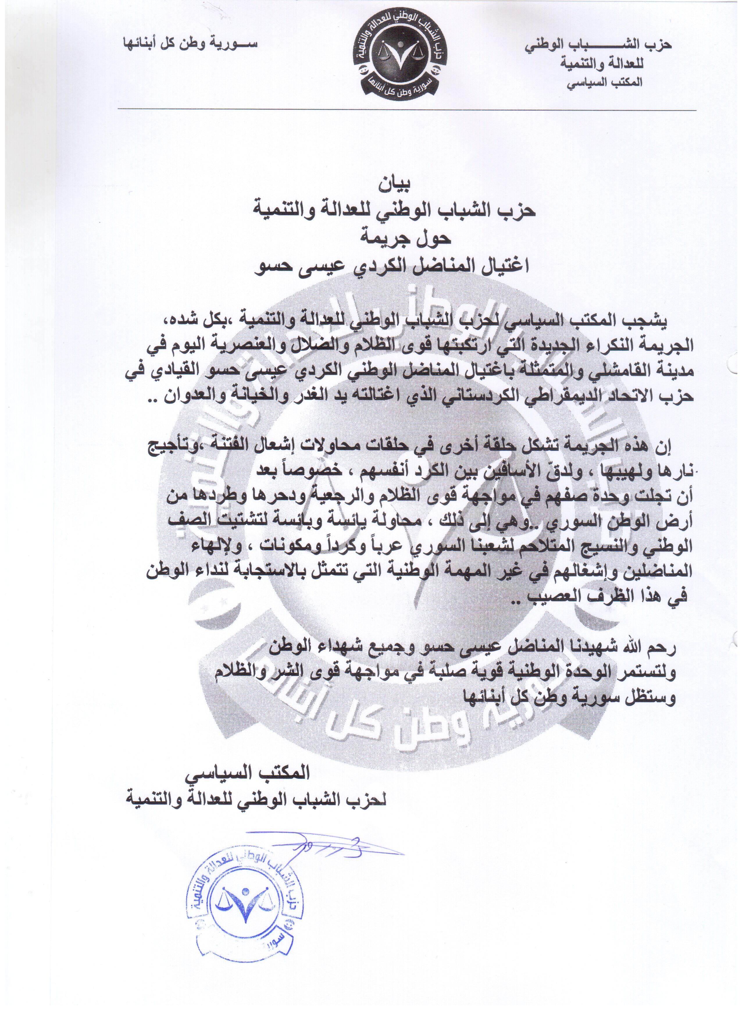 يشجب المكتب السياسي لحزب الشباب الوطني للعدالة و التنمية , بكل شده, الجريمة النكراء الجديدة التي ارتكبتها قوى الظلام و الضلال و العنصرية اليوم في مدينة القامشلي المتمثلة باعتيال المناضل الوطني الكردي عيسى حسو القيادي في حزب الاتحاد الديمقراطي الكردستاني الذي اغتالته يد الغدر و الخيانة و العدوان..