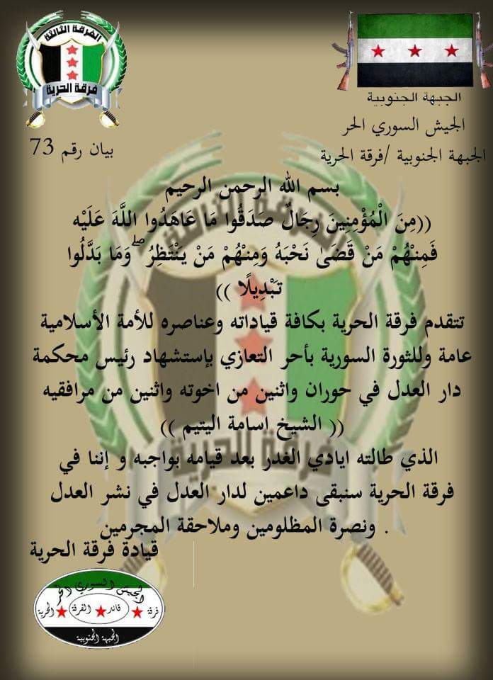 بيان من فرقة الحرية تعزي فيه بالشيخ أسامة اليتيم رئيس محكمة دار العدل في حوران