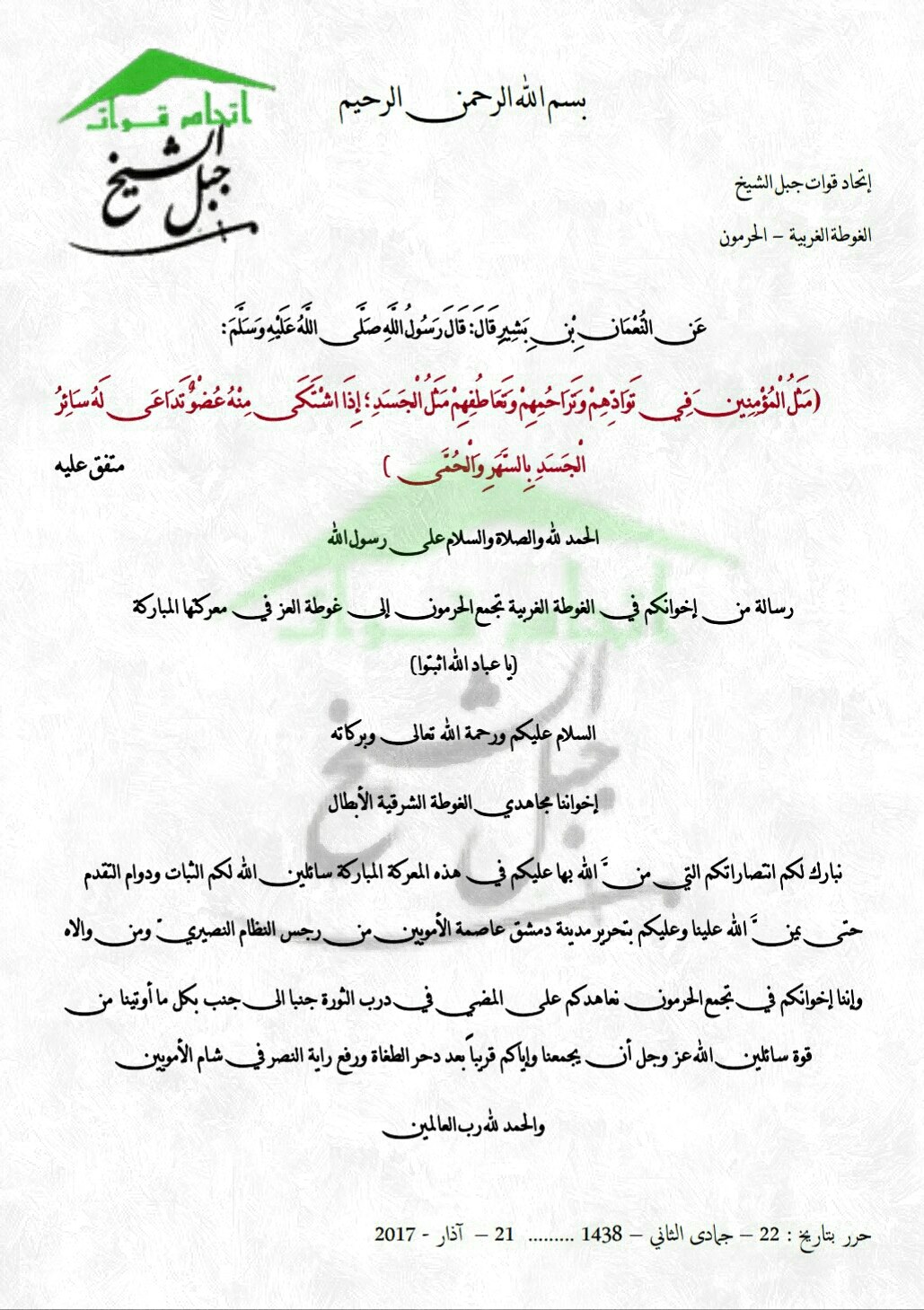 بيان صادر من إتحاد قوات جبل الشيخ يبارك فيه لأهالي الغوطة الشرقية بالانتصارات في معركة يا عباد الله اثبتوا