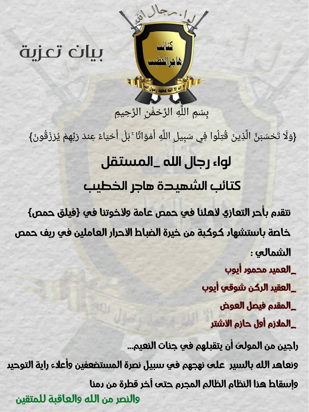 بيان من كتائب الشهيدة هاجر الخطيب تعزي فيه فيلق حمص بعدد من مقاتليه