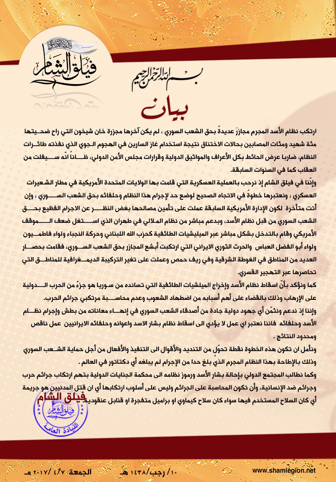 بيان ترحيب من "فيلق الشام" بالعملية العسكرية الأمريكية على مطار الشعيرات العسكري