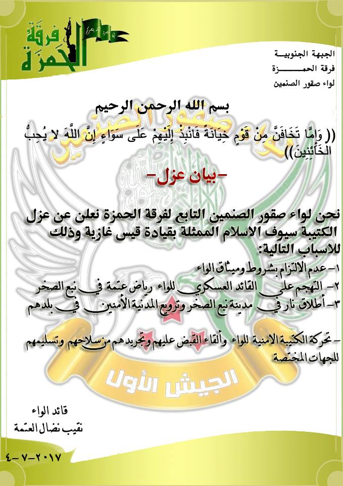 بيان من لواء صقور الصنمين حول فصل كتيبة سيوف الإسلام من اللواء