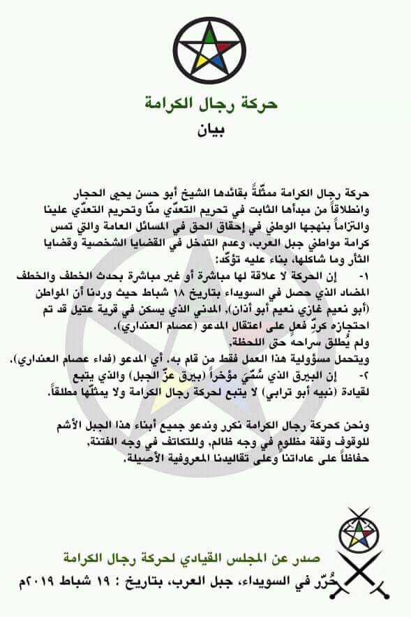 بيان من حركة رجال الكرامة تنفي فيه علاقتها بحادثة الخطف والخطف المضاد التي حدثت في السويداء بتاريخ 18/2/2019