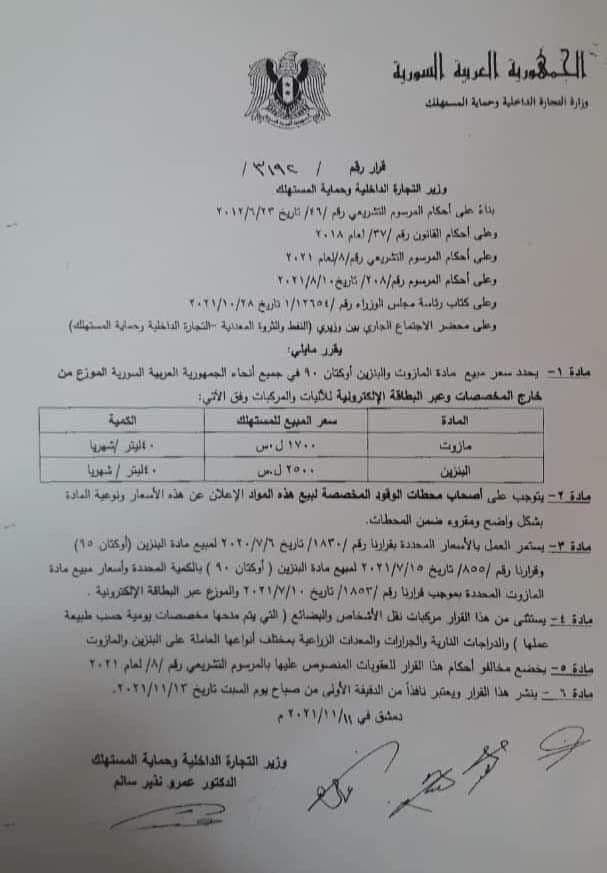 بيان من وزارة التجارة الداخلية وحماية المستهلك سعر مبيع مادة المازوت والبنزين أوكتان 90 الموزع خارج المخصصات وعبر البطاقة الالكترونية للآليات والمركبات