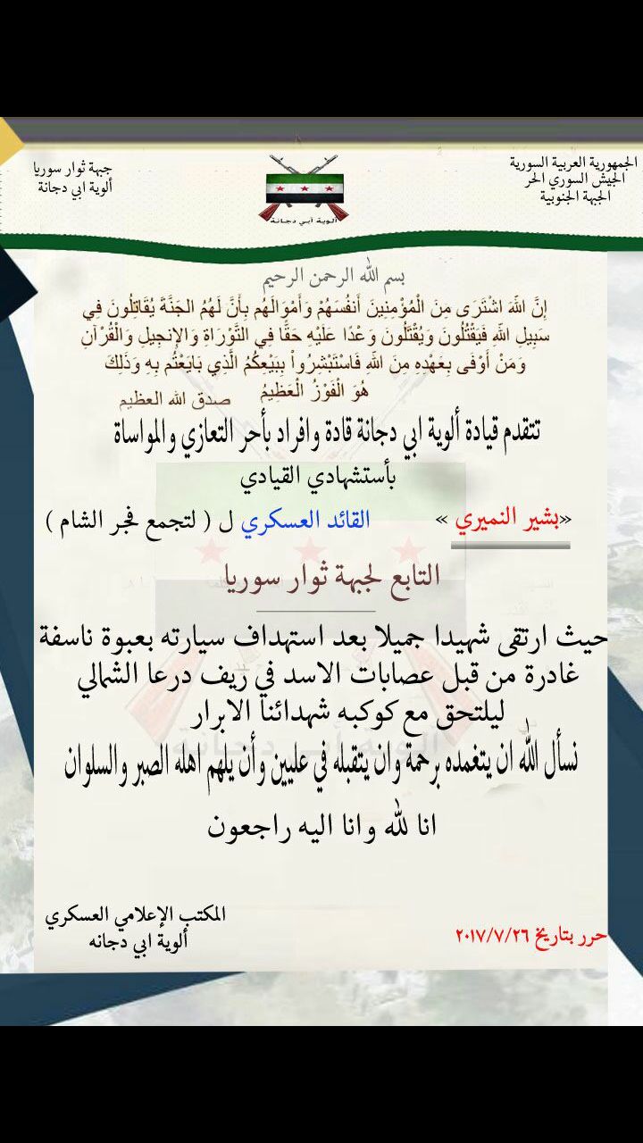 بيان من ألوية أبي دجانة جبهة ثوار سورية تعزي فيه بالقائد العسكري لتجمع فجر الشام بشير النميري