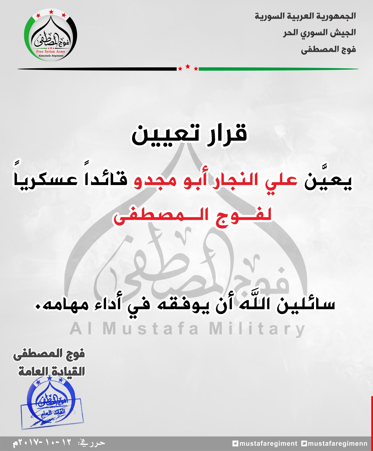 قرار من فوج المصطفى بتعين علي النجار قائداً عسكرياً للفوج