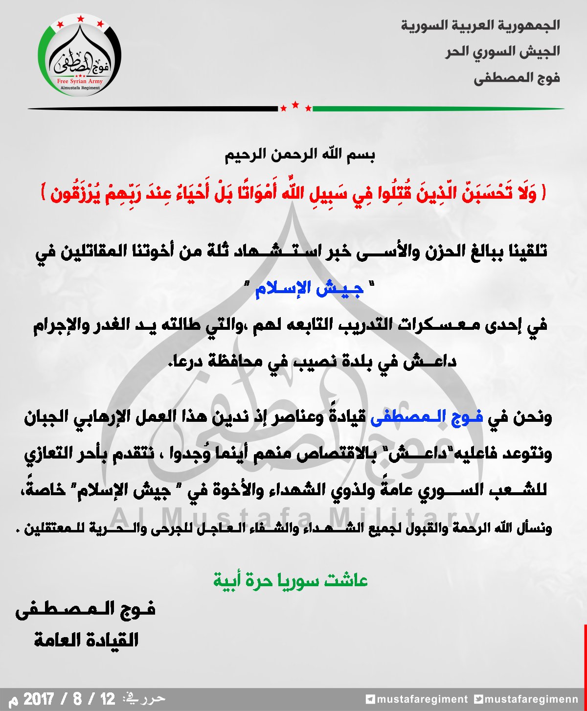 بيان من فوج المصطفى يعزي فيه جيش الإسلام بعدد من مقاتليه في بلدة نصيب في درعا