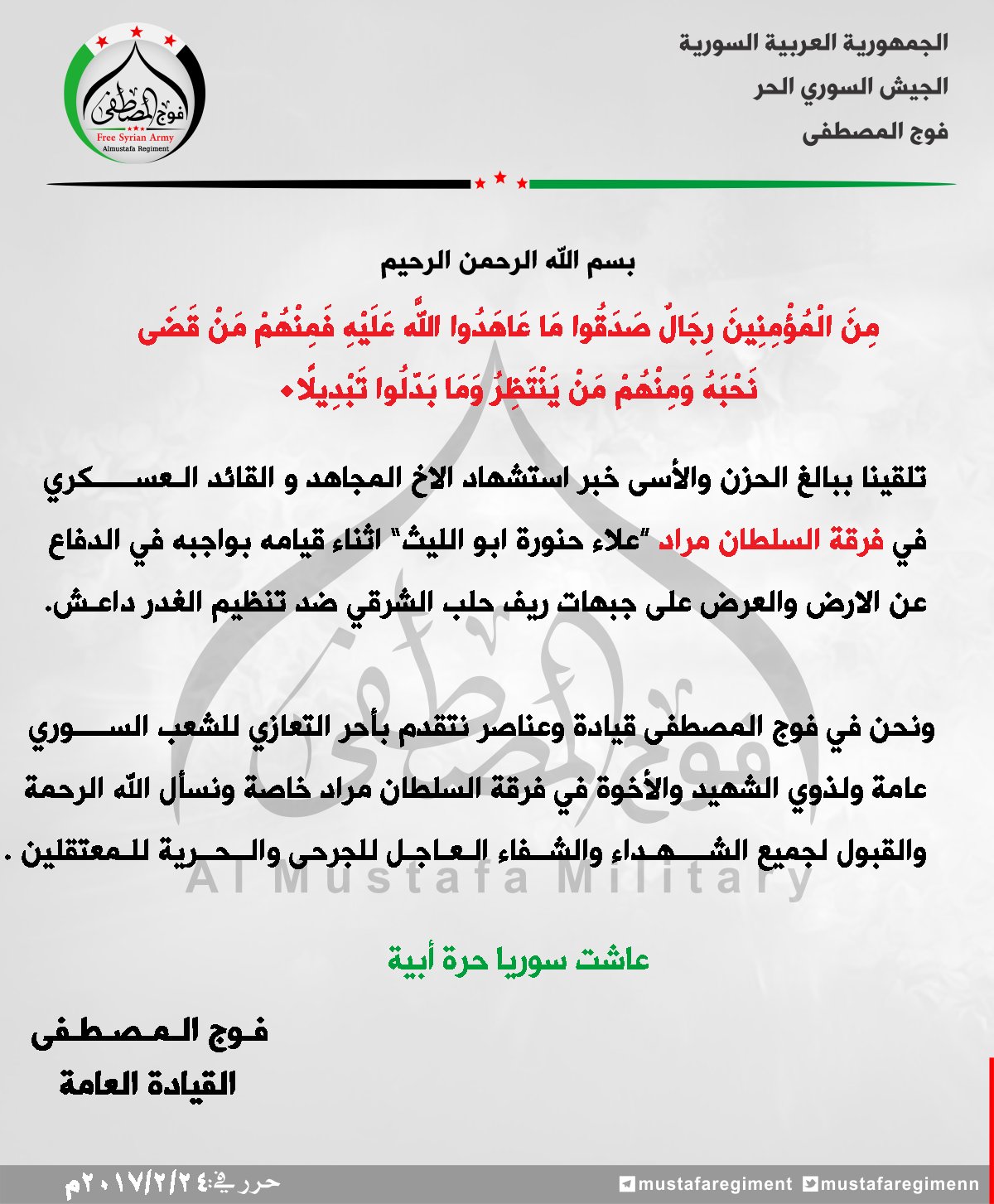 بيان من فوج المصطفى يعزي فيه فرقة السطان مراد بالقائد العسكري علاء حنورة