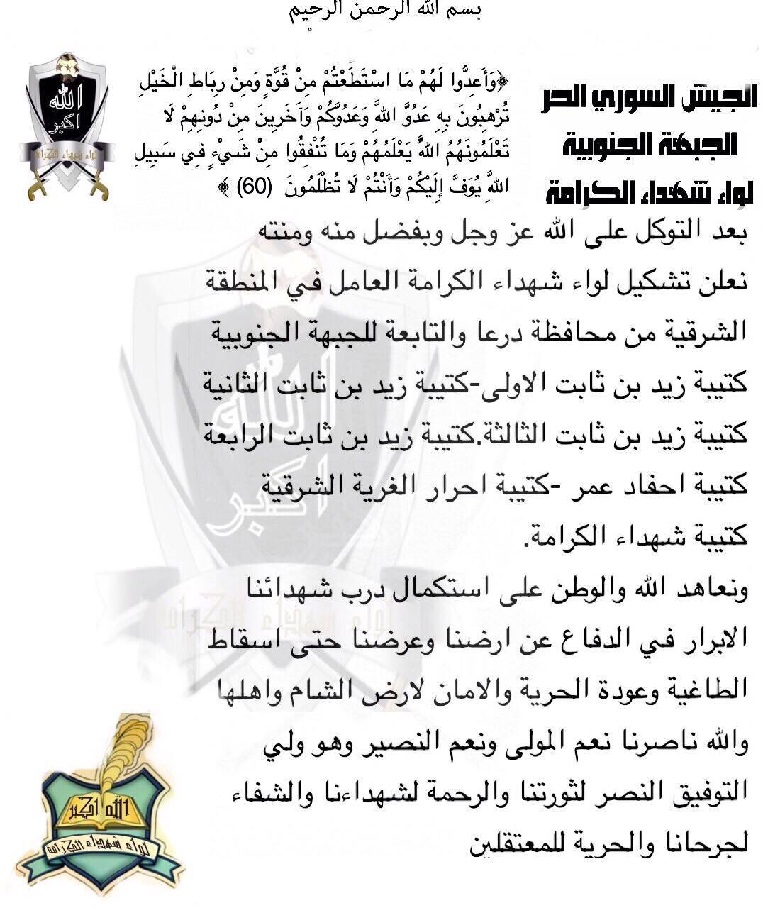 بيان تشكيل لواء شهداء الكرامة في المنطقة الشرقية من محافظة درعا