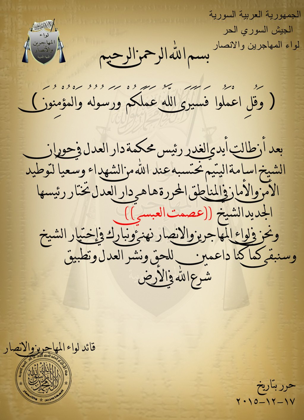 بيان من لواء المهاجرين والأنصار يعزي فيه بالشيخ أسامة اليتيم رئيس محكمة دار العدل