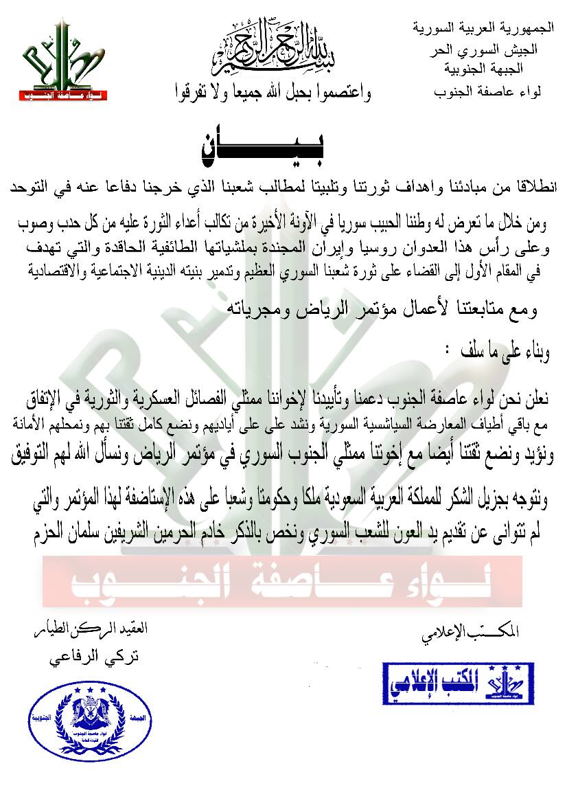 بيان تأييد من لواء عاصفة الجنوب لمخرجات مؤتمر الرياض