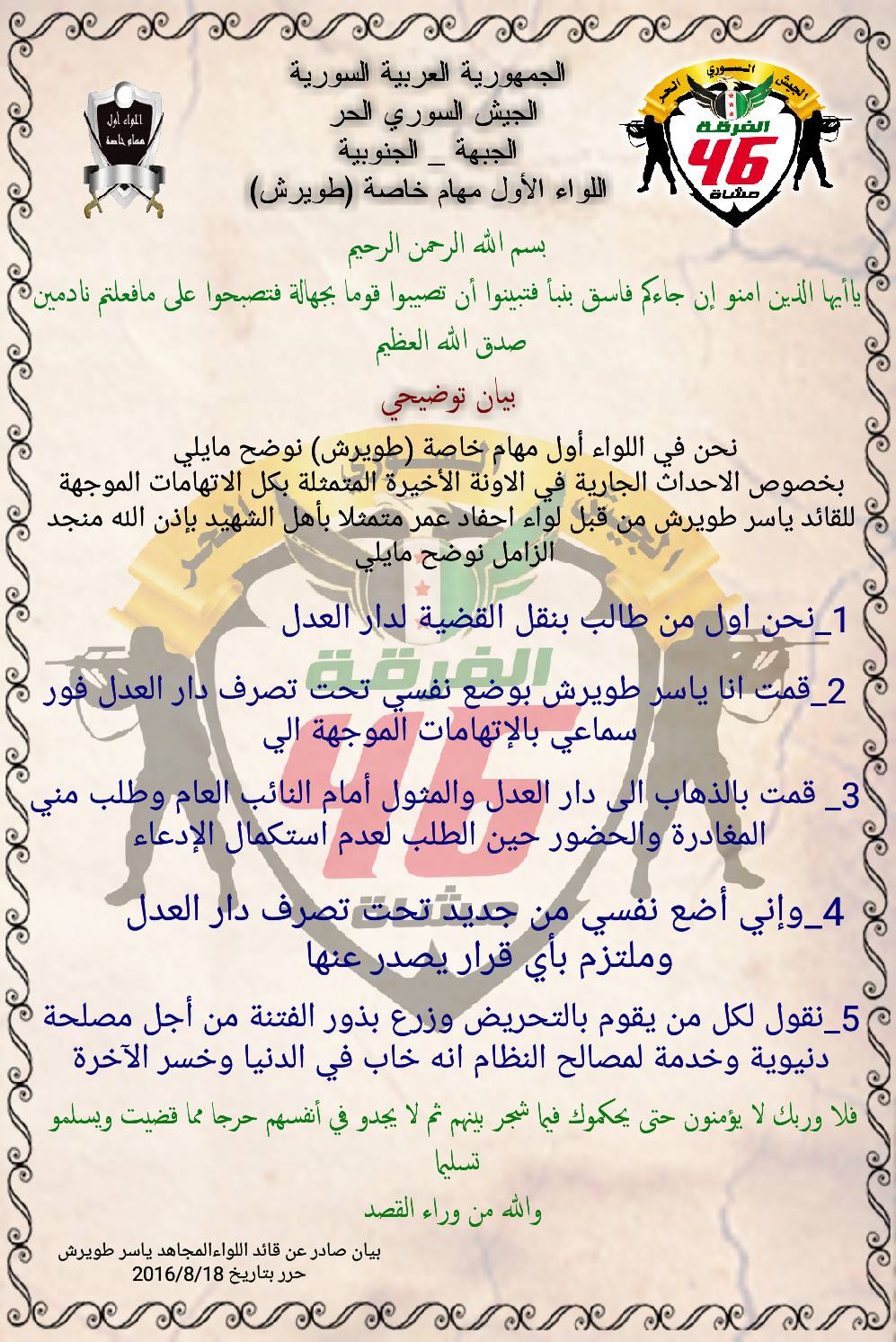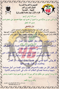 بيان من اللواء الأول مهام خاصة التابع للفرقة 46 مشاة حول الإتهامات الموجهة لقائد اللواء بخصوص مقتل منجد الزامل