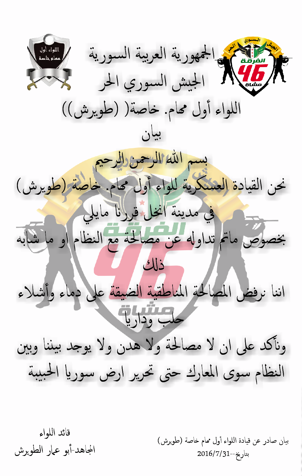 بيان من اللواء الأول مهام خاصة يعلن فيه رفضه جميع أنواع المصالحة مع النظام السوري