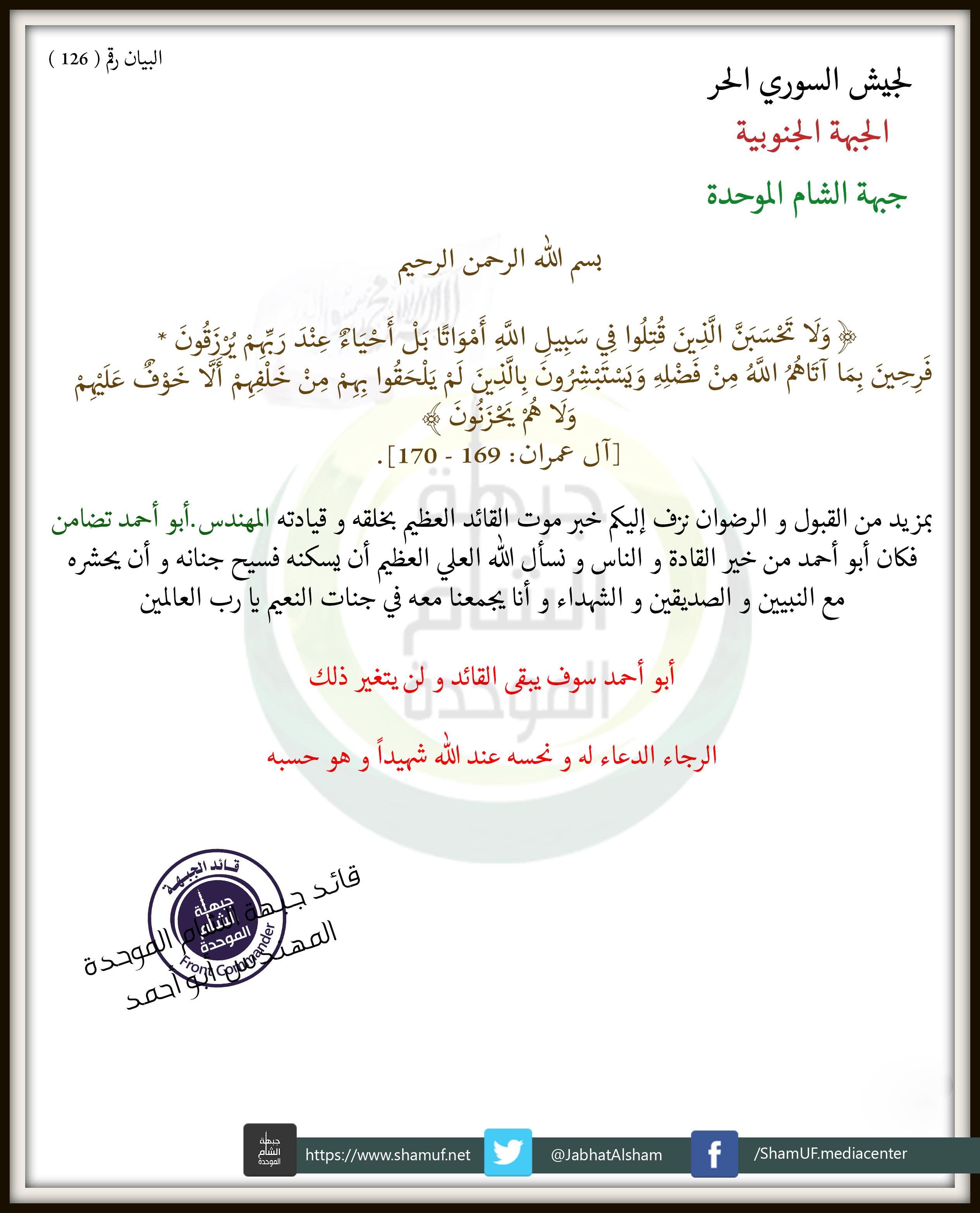بيان من جبهة الشام الموحدة تنعي فيه قائدها أبو أحمد تضامن