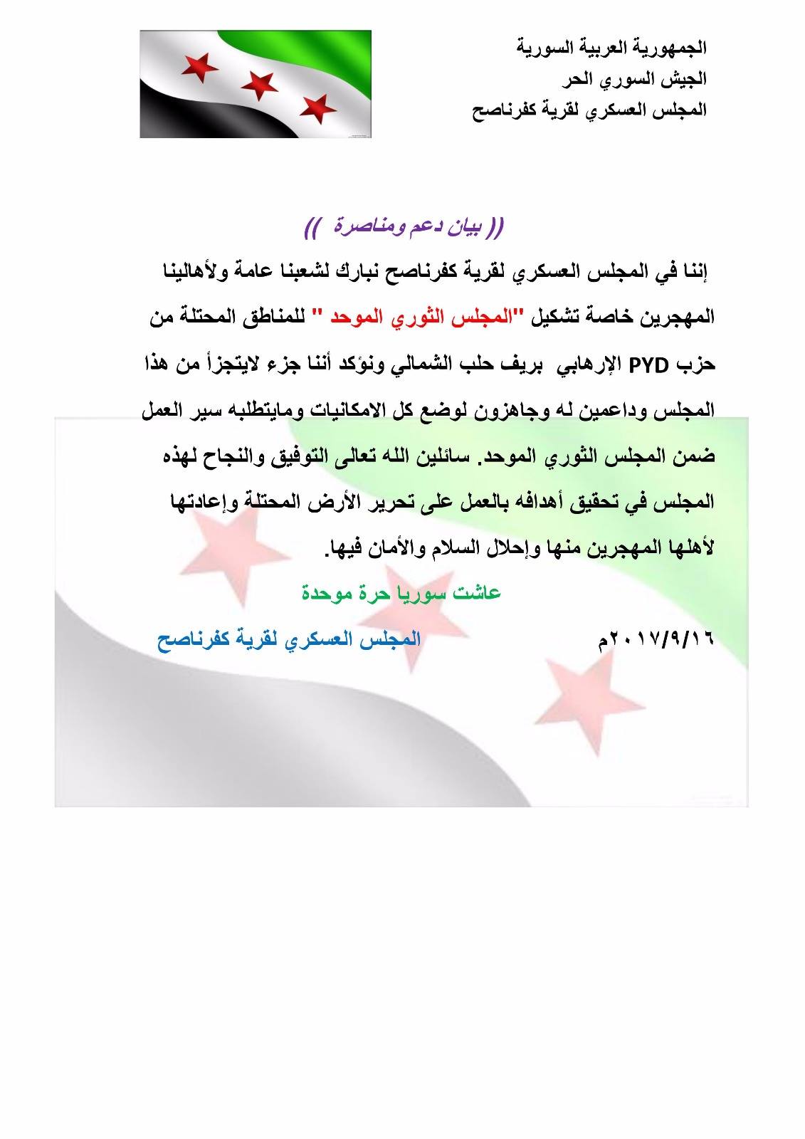بيان من المجلس العسكري لقرية كفر ناصح يبارك فيه تشكيل المجلس الثوري الموحد