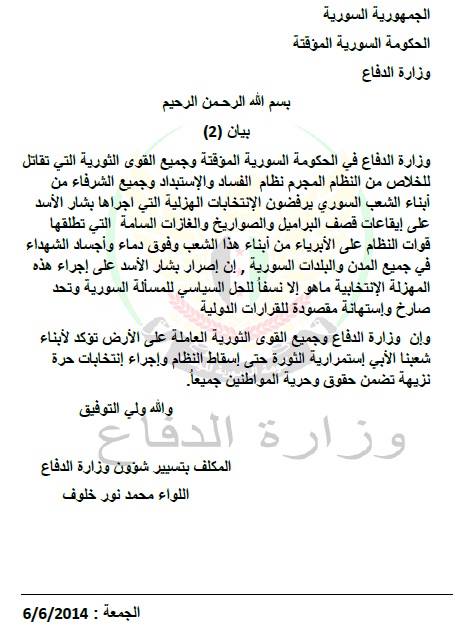 وزارة الدفاع في الحكومة السورية المؤقتة وجميع القوى الثورية التي تقاتل للخلاص من النظام المجرم نظام الفساد والإستبداد وجميع الشرفاء من أبناء الشعب السوري يرفضون الإنتخابات الهزلية التي اجراها بشار الأسد على إيقاعات قصف البراميل والصواريخ والغازات السامة التي تطلقها قوات النظام على الأبرياء من أبناء هذا الشعب وفوق دماء وأجساد الشهداء في جميع المدن والبلدات السورية