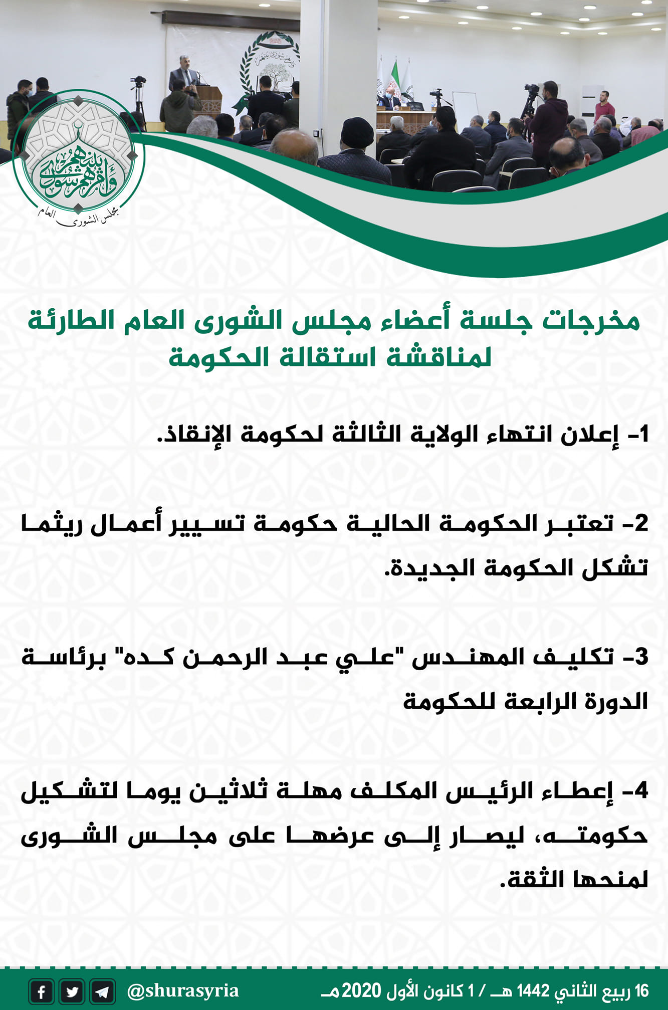 مخرجات الجلسة جلسة أعضاء مجلس الشورى العام الطارئة لمناقشة استقالة الحكومة