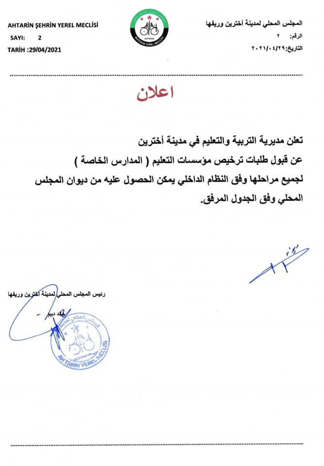 قرار من المجلس المحلي لمدينة أخترين بشأن بدء قبول طلبات ترخيص المدارس التعليمية الخاصة