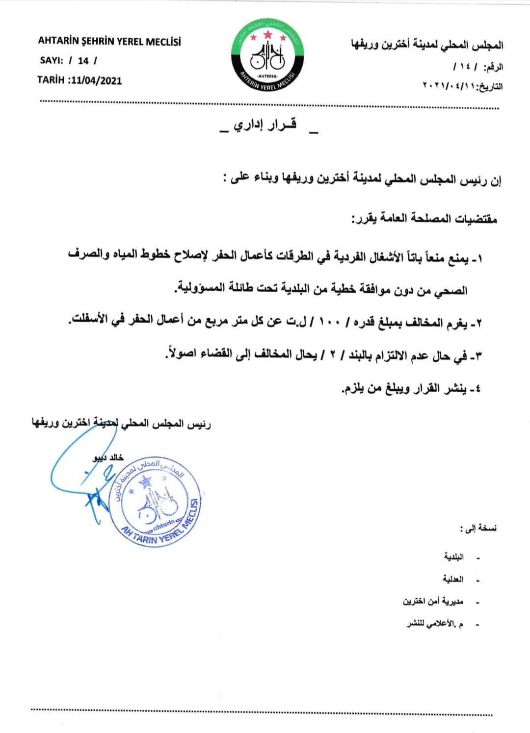 تعميم من المجلس المحلي لمدينة أخترين بمنع الأشغال الفردية في الطرقات من دون موافقة البلدية