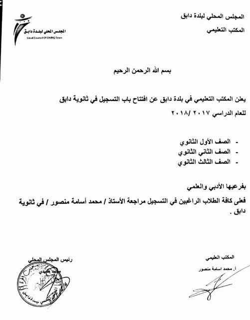 إعلان من المكتب التعليمي في المجلس المحلي لبلدة دابق عن افتتاح التسجيل في ثانوية دابق للعام الدراسي (2017_2018)