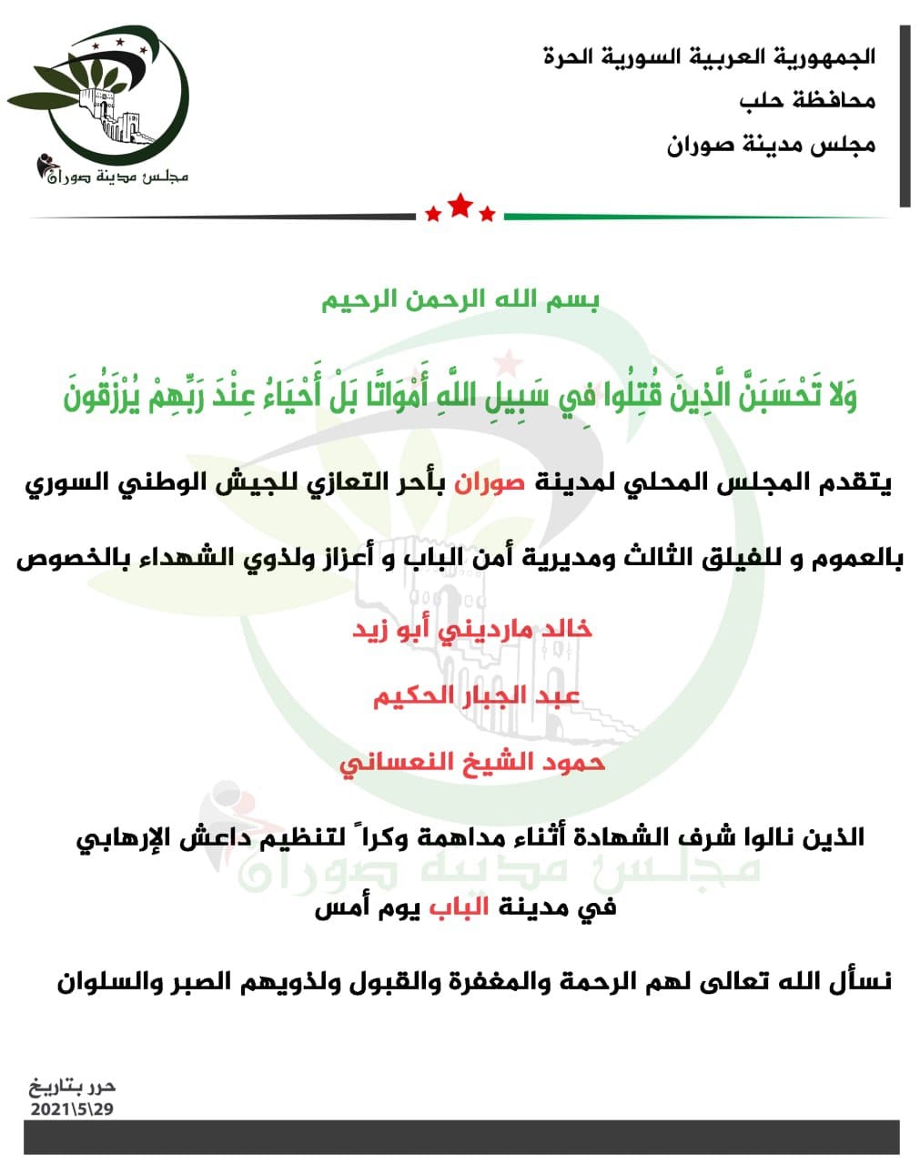 بيان من المجلس المحلي لمدينة صوران يعزي فيه الجيش الوطني بعدد من العناصر أثناء مداهمة أحد أوكار تنظيم الدولة