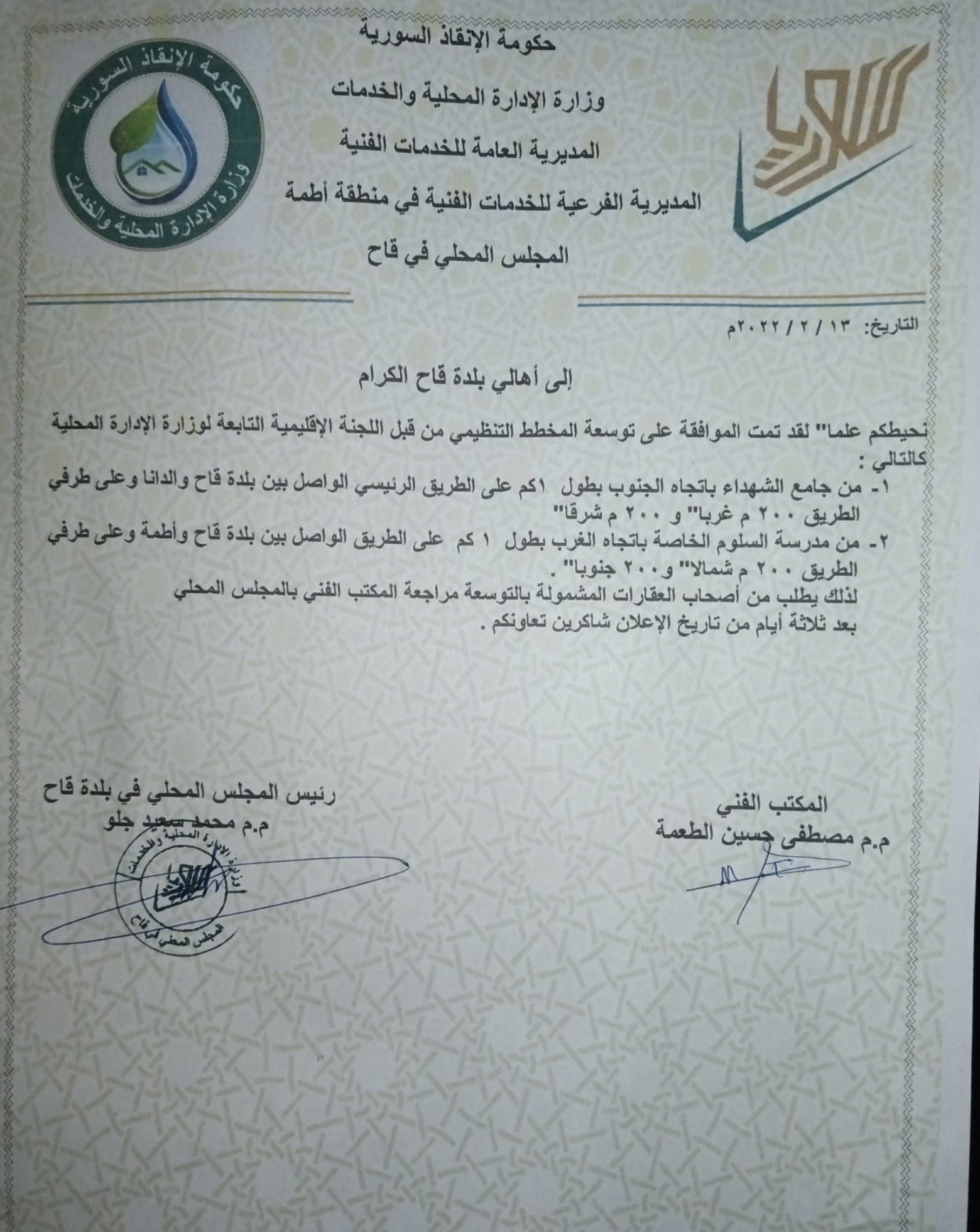 تعميم من المجلس المحلي في بلدة قاح يخص توسعة المخطط التنظيمي لبلدة قاح