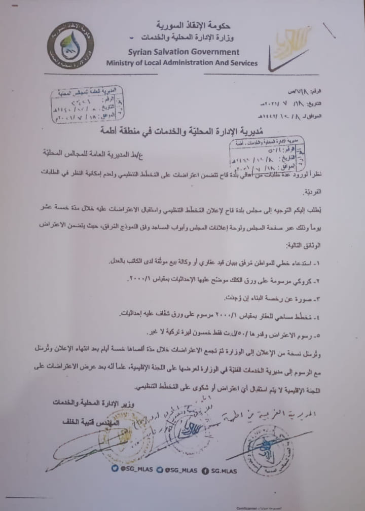 تعميم من وزارة الإدارة المحلية بخصوص مراجعة المجلس المحلي في البلدة وتقديم طلب الإعتراض على المخطط التنظيمي