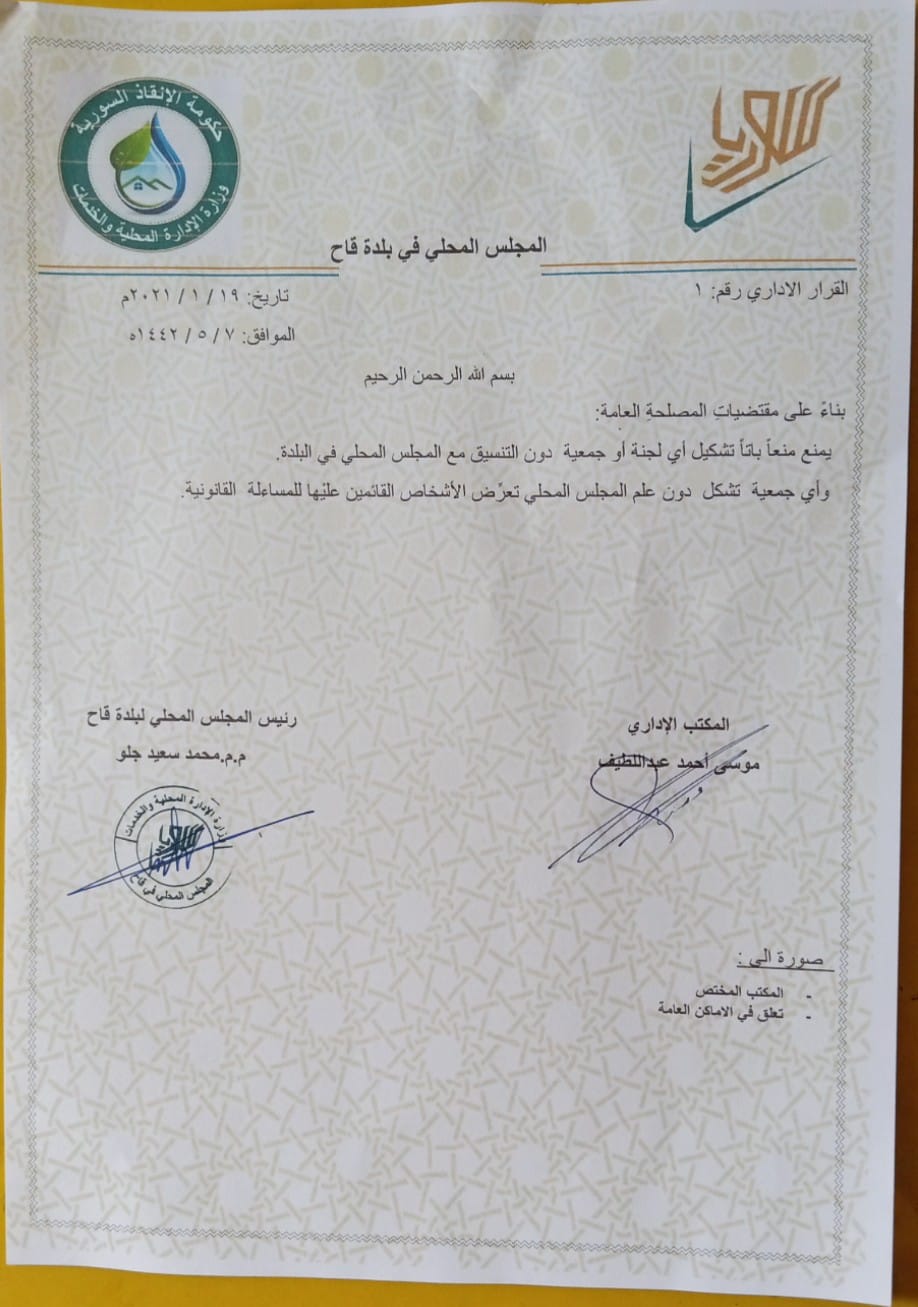 تعميم من المجلس المحلي في بلدة قاح بمنع تشكيل أي لجنة أو جمعية دون التنسيق مع المجلس المحلي