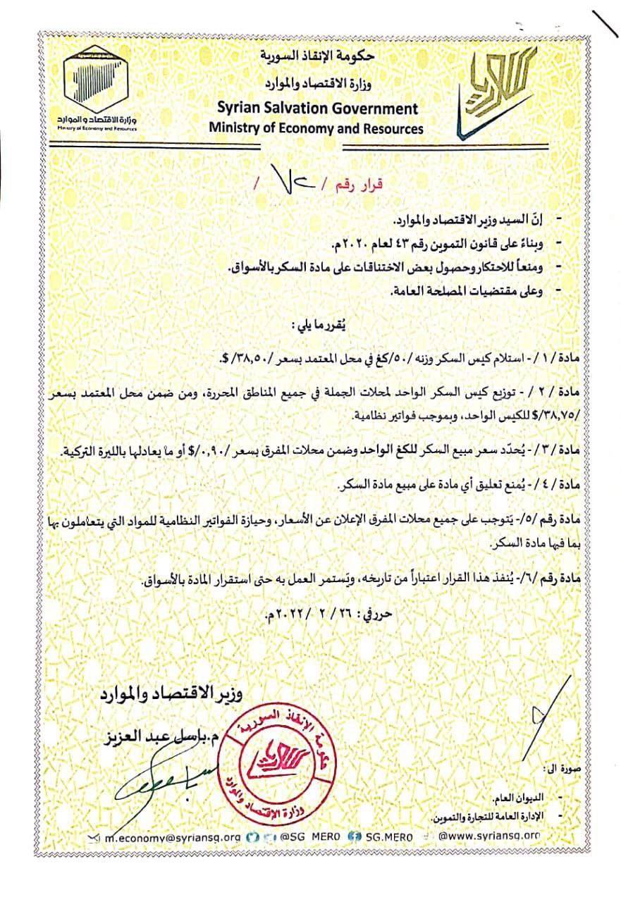 تعميم من وزارة الإقتصاد والموارد في حكومة الإنقاذ بشأن تحد سعر مبيع مادة السكر