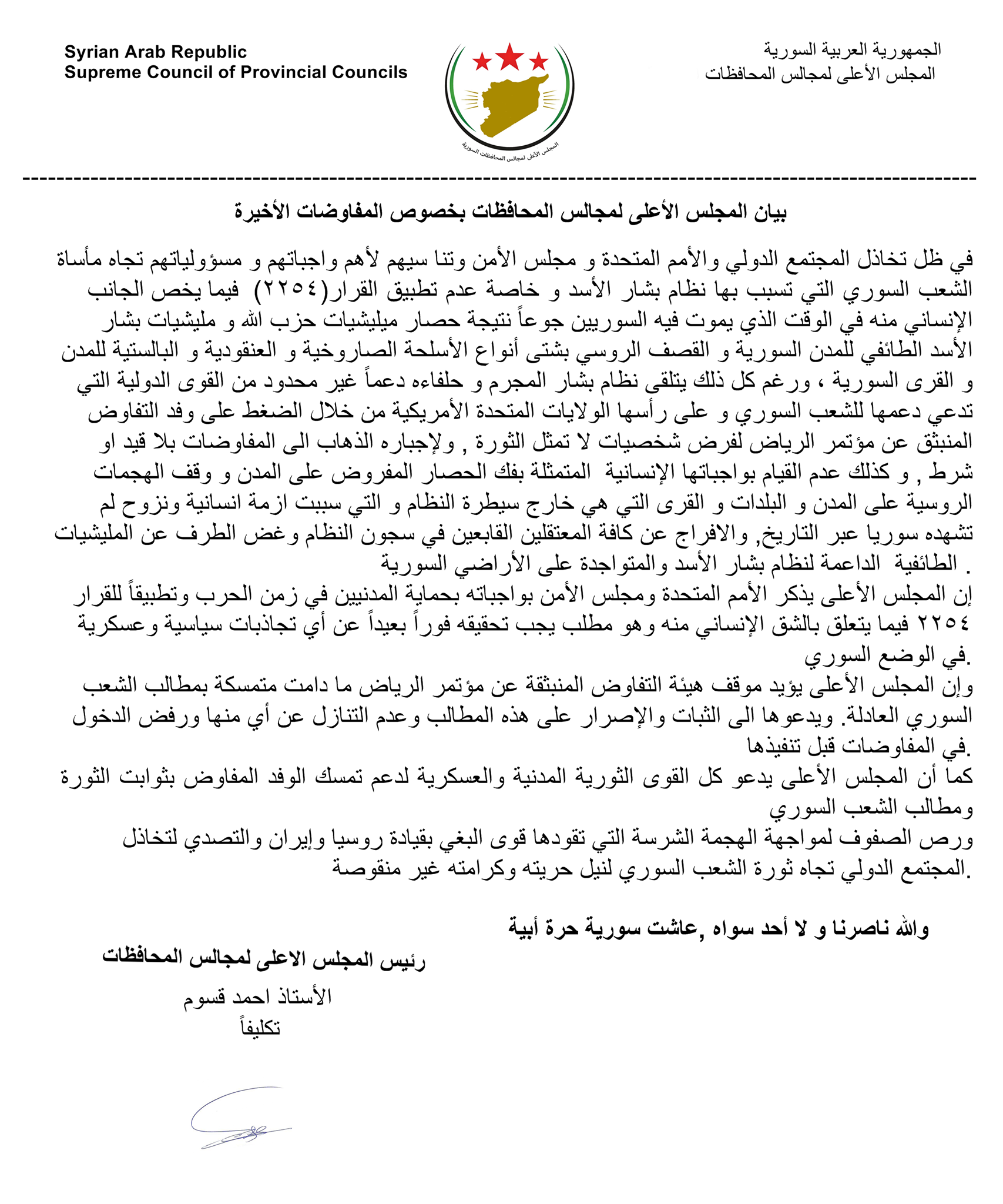 وإن المجلس الأعلى يؤيد موقف هيئة التفاوض المنبثقة عن مؤتمر الرياض ما دامت متمسكة بمطالب الشعب السوري العادلة. ويدعوها الى الثبات والإصرار على هذه المطالب وعدم التنازل عن أي منها ورفض الدخول في المفاوضات قبل تنفيذها.