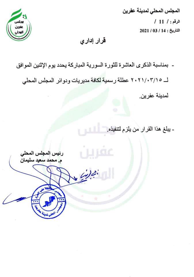 بمناسبة الذكرى العاشرة للثورة السورية المباركة يحدد يوم الإثنين الموافق ل 15/3/2021 عطلة رسمية لكافة مديريات ودوائر المجلس المحلي لمدينة عفرين