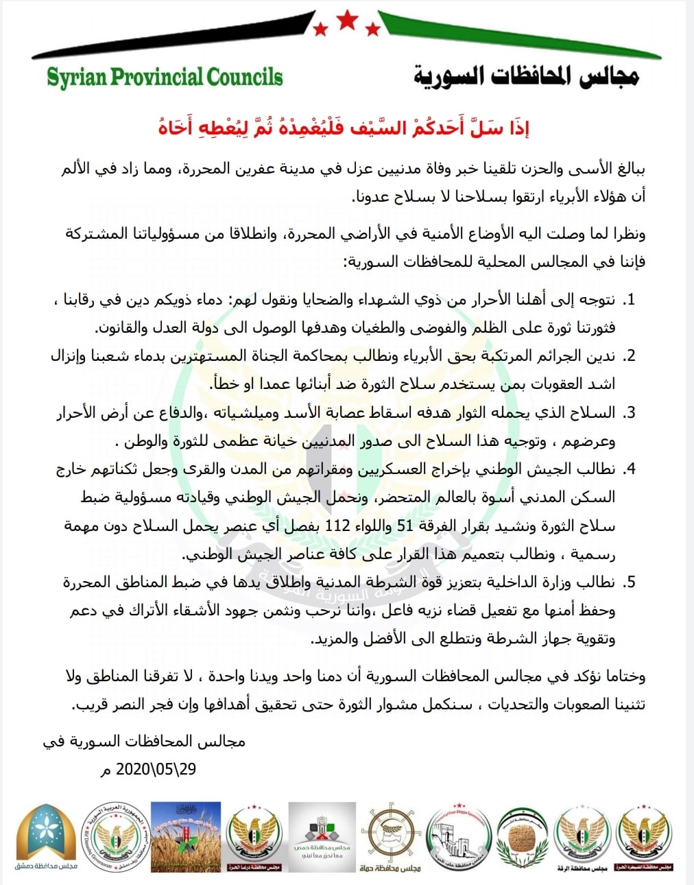 بيان مشترك من مجالس المحافظات السورية بخصوص الاحداث التي شهدتها مدينة عفرين