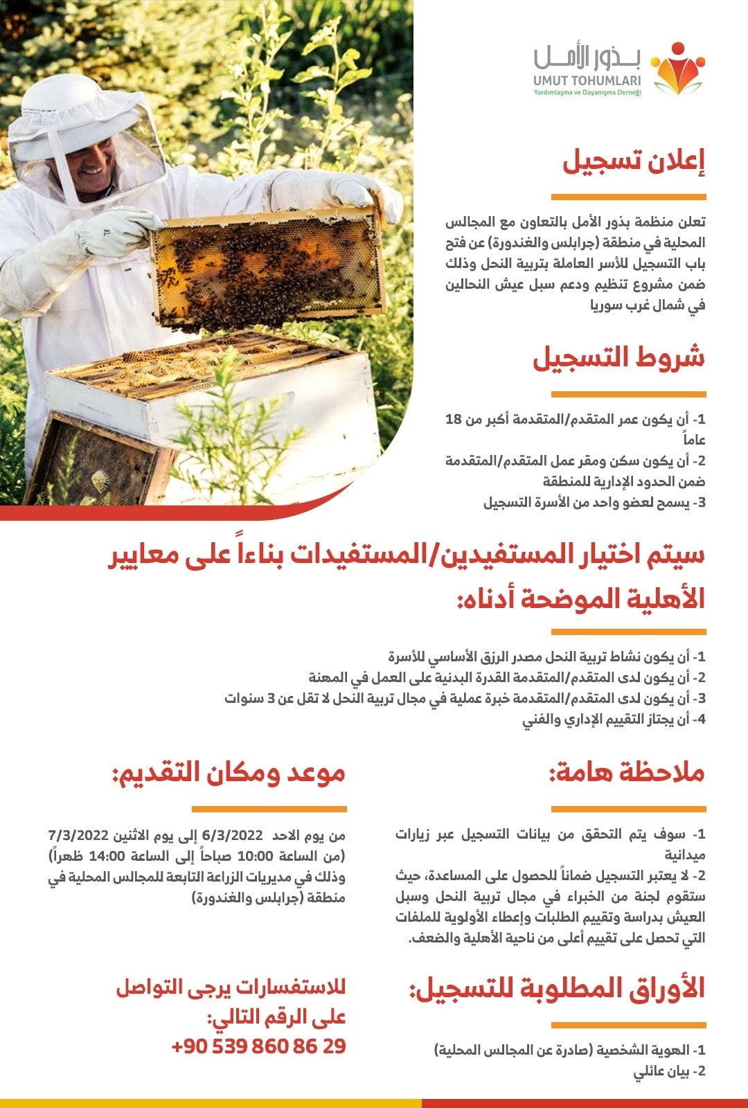 إعلان من منظمة بذور الأمل عن إطلاقها مشروع تنظيم ودعم سبل العيش للنحالين شمالي سوريا