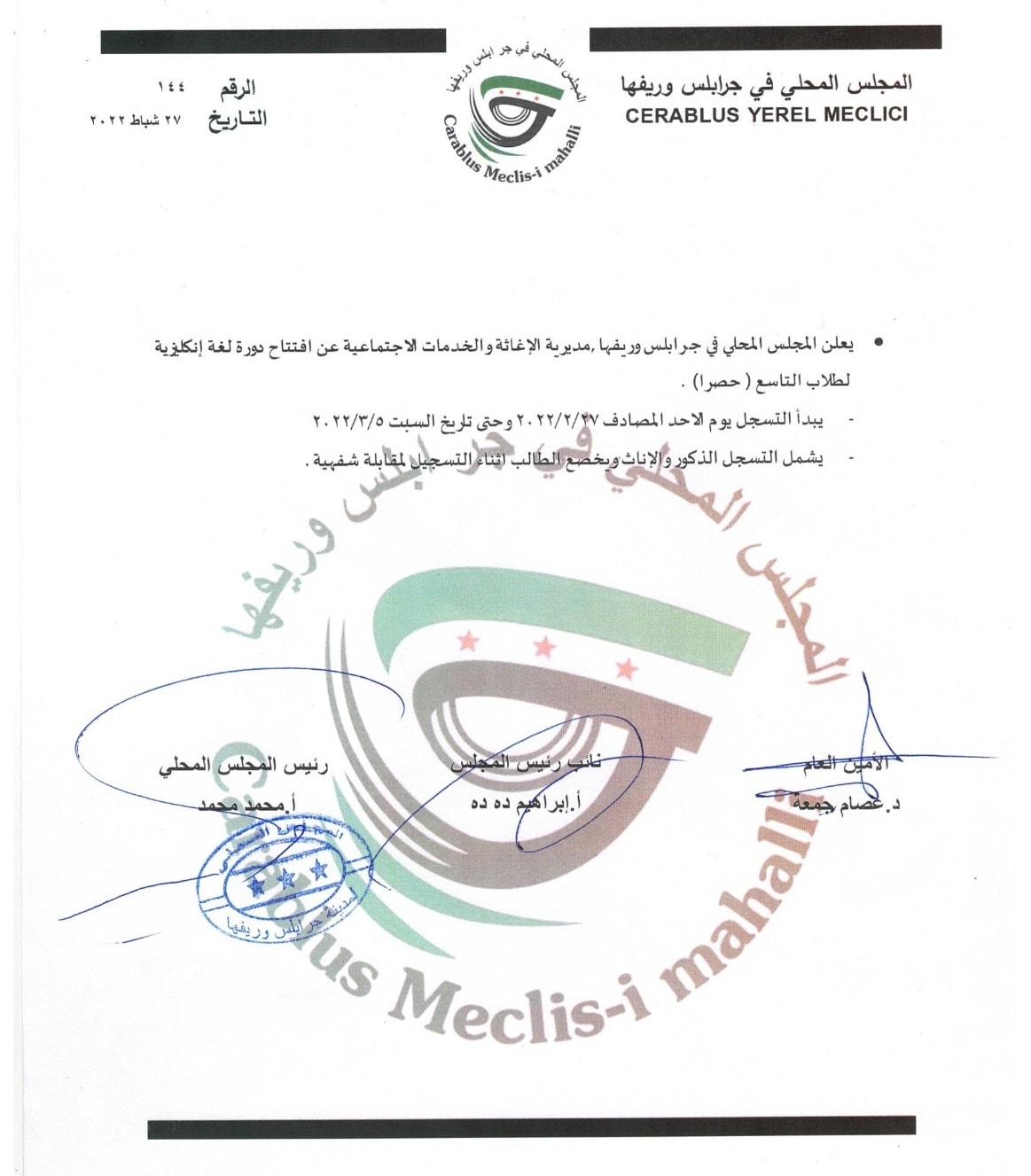 إعلان من المجلس المحلي لمدينة جرابلس وريفها بشأن افتتحاحه دورات تعلم لغة انجليزية