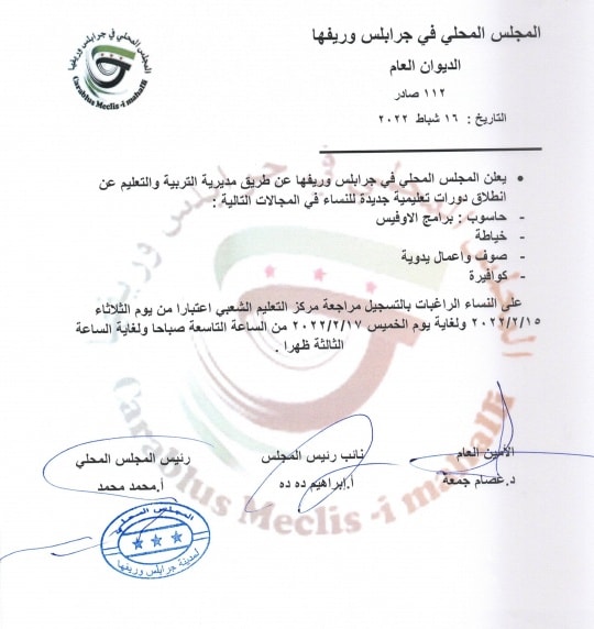 إعلان من المجلس المحلي لمدينة جرابلس وريفها بشأن اطلاق دورات تعليمية جديدة للنساء