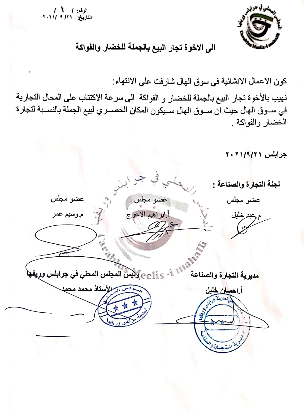 إعلان من المجلس المحلي لمدينة جرابلس وريفها حول الإكتتاب على محال سوق الهال