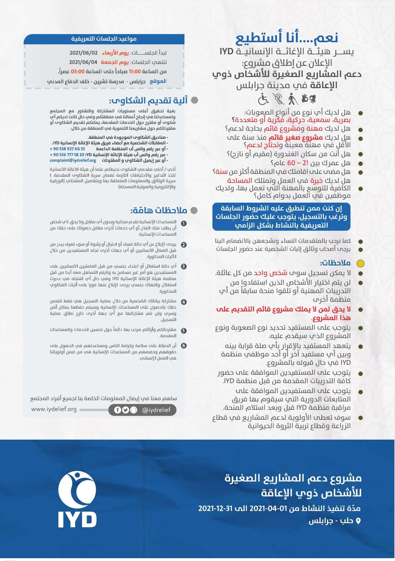 إعلان من هيئة الإغاثة الإنسانية IYD بشأن تعاونها مع مجلس مدينة جرابلس لإطلاق مشروع دعم المشاريع الصغيرة للأشخاص ذوي الإعاقة