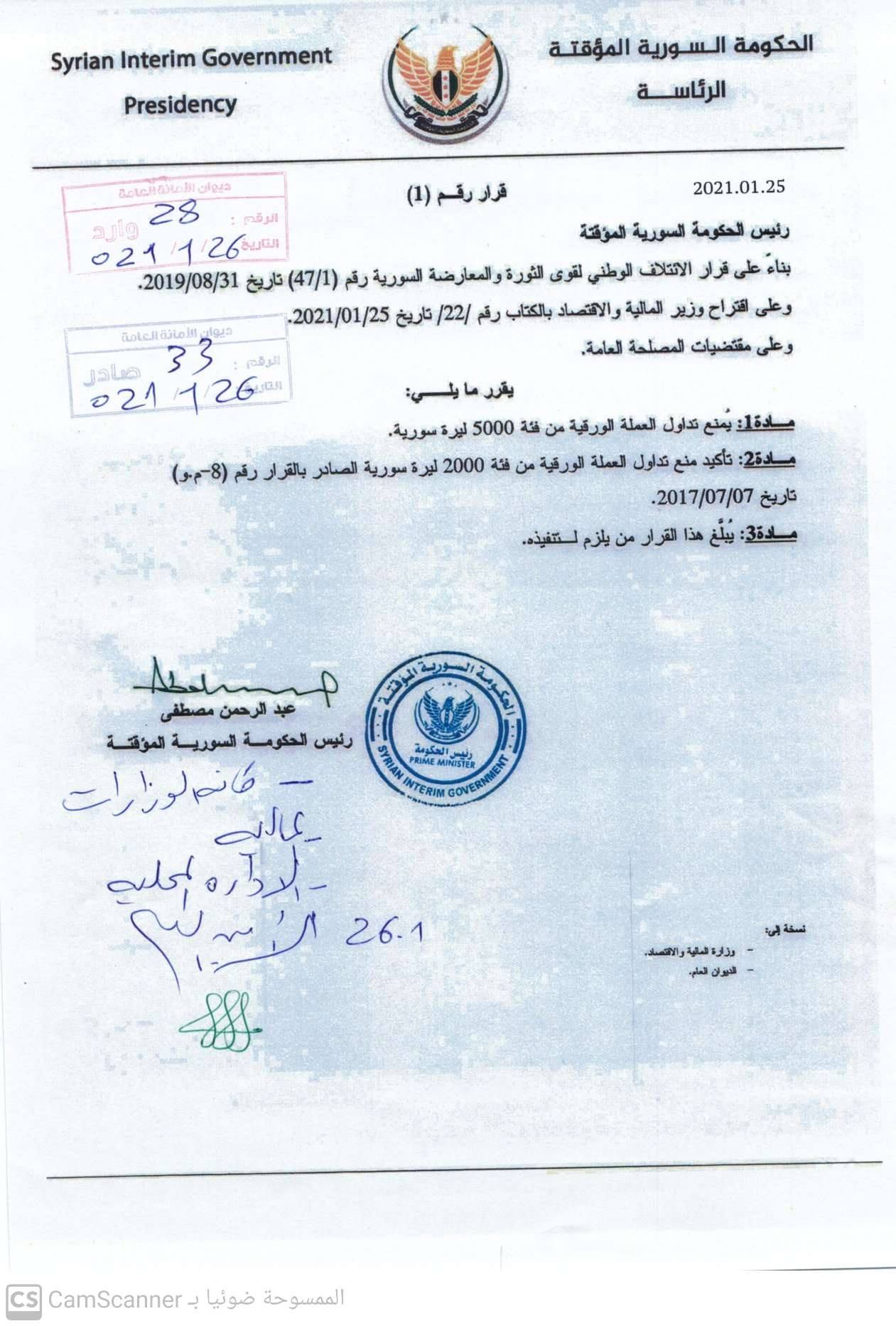 قرار صادر عن الحكومة السورية المؤقتة حول تداول العملات من فئة/ 2000 / و فئة / 5000 / ليرة سورية في المناطق المحررة