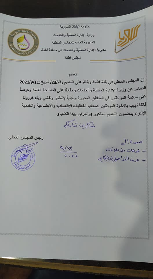 تعميم من المجلس المحلي لقرية اطمة الحدودية يدعوا فيه الأهالي إلى الإلتزام بتعميم وزارة الإدارة المحلية والخدمات بشأن فيروس كورونا