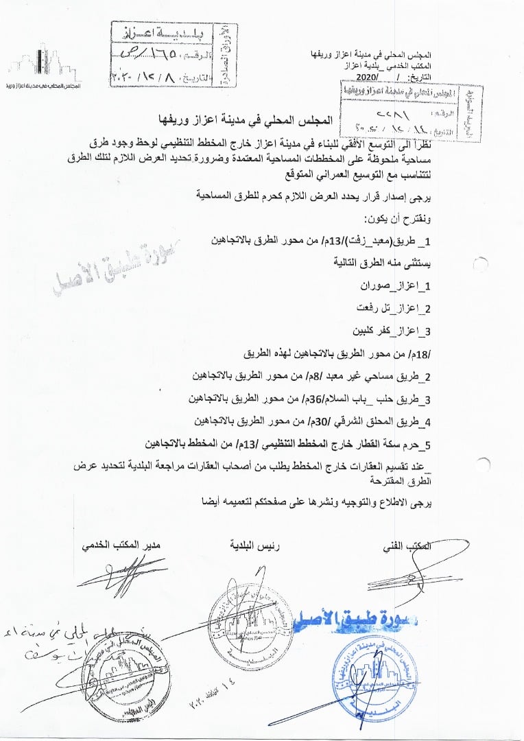 تعميم من المجلس المحلي في مدينة أعزاز وريفها بشأن تحديد مساحة حرم الطريق